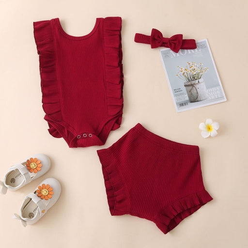 Girls' pit strip sleeveless solid lace shorts bow three piece set