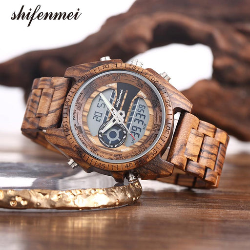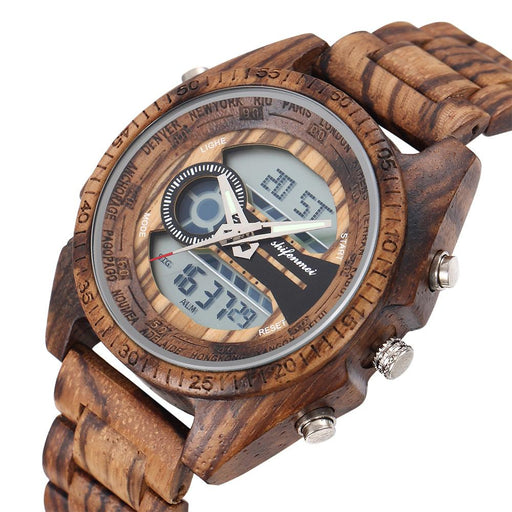 New LCD Dual Display Electronic Outdoor Sports Luminous Wooden Watch